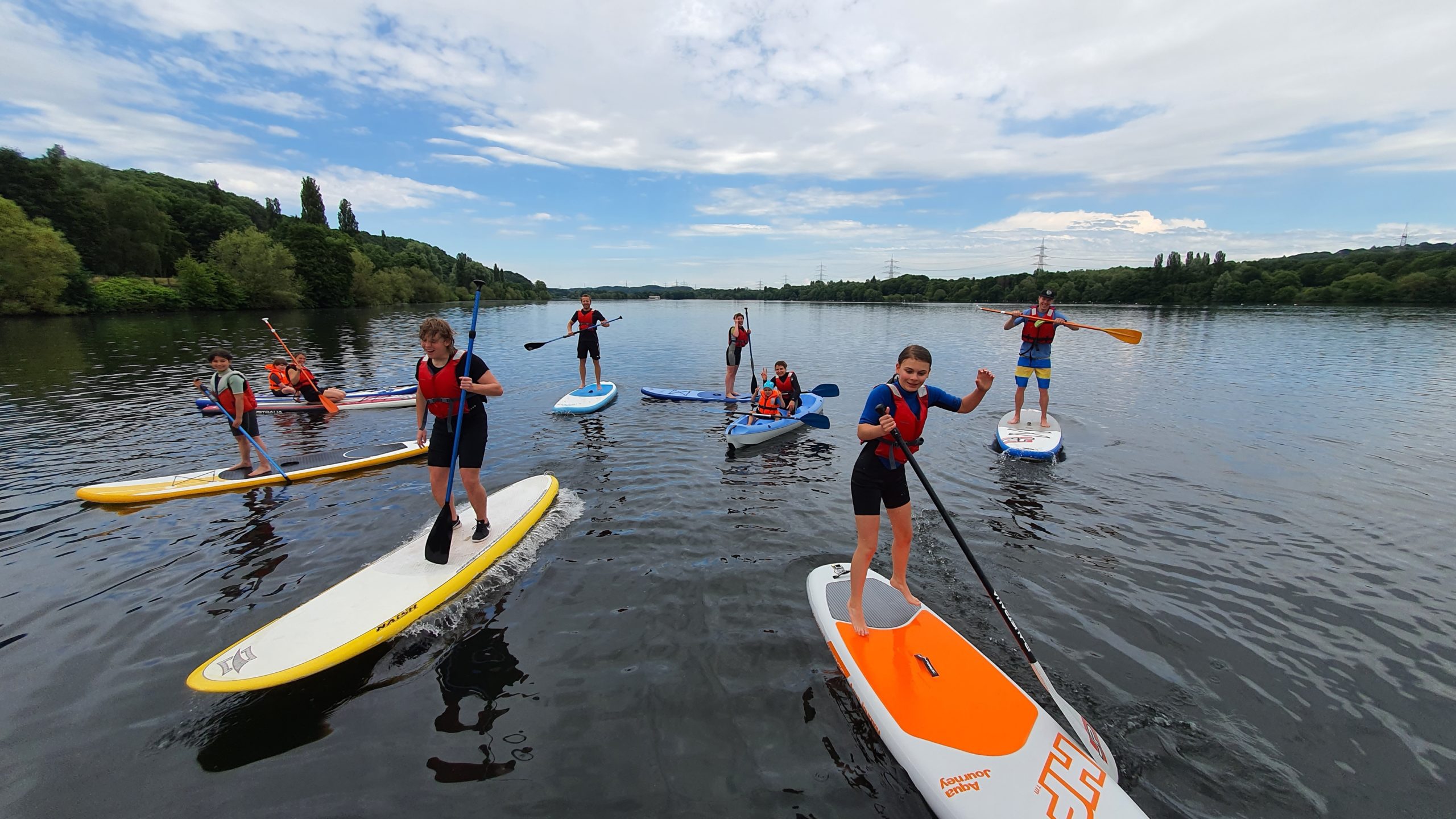 Die erste Aktivität fand am Samstag, den 13.06.2020 mit einem Schnuppertag SUP und Kanu am Kemnader See in Bochum statt. Um alle Regularien (MAGS and Nutzungskonzept) einzuhalten und die Mindestabstände sicher zu stellen, wurde der Aktionstag in zwei Kleingruppen unterteilt. Bei bestem Wetter konnten insgesamt 14 TeilnehmerInnen, bestehend aus betroffenen Kindern und Jugendlichen, ihren Buddys und Familienangehörigen, neue Sportarten auf dem Wasser ausprobieren und möglicherweise auch langfristig für sich entdecken.
