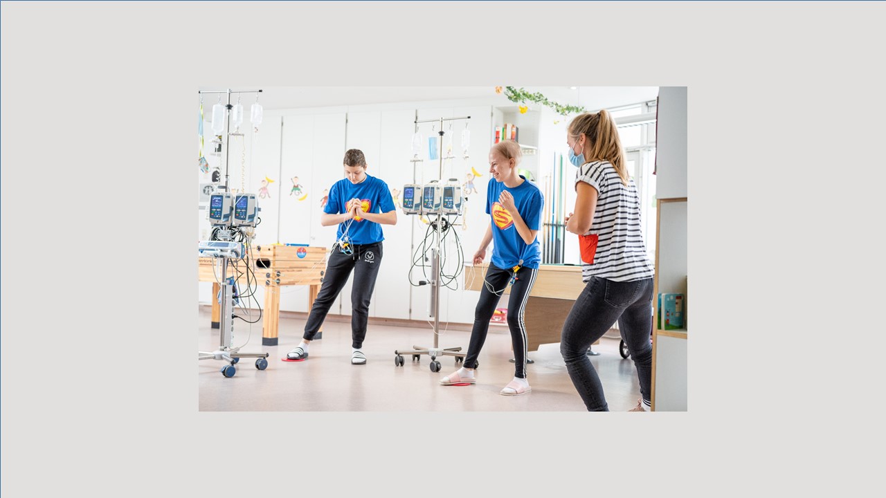 An drei Tagen in der Woche bewegt eine Sportwissenschaftlerin und Sporttherapeutin im Rahmen einer Projektarbeit ihres Masterstudiums mit Unterstützung durch das komplette kinderonkologische Behandlungsteam die Kinder und Jugendlichen, die auf der kinderonkologischen Station betreut werden.