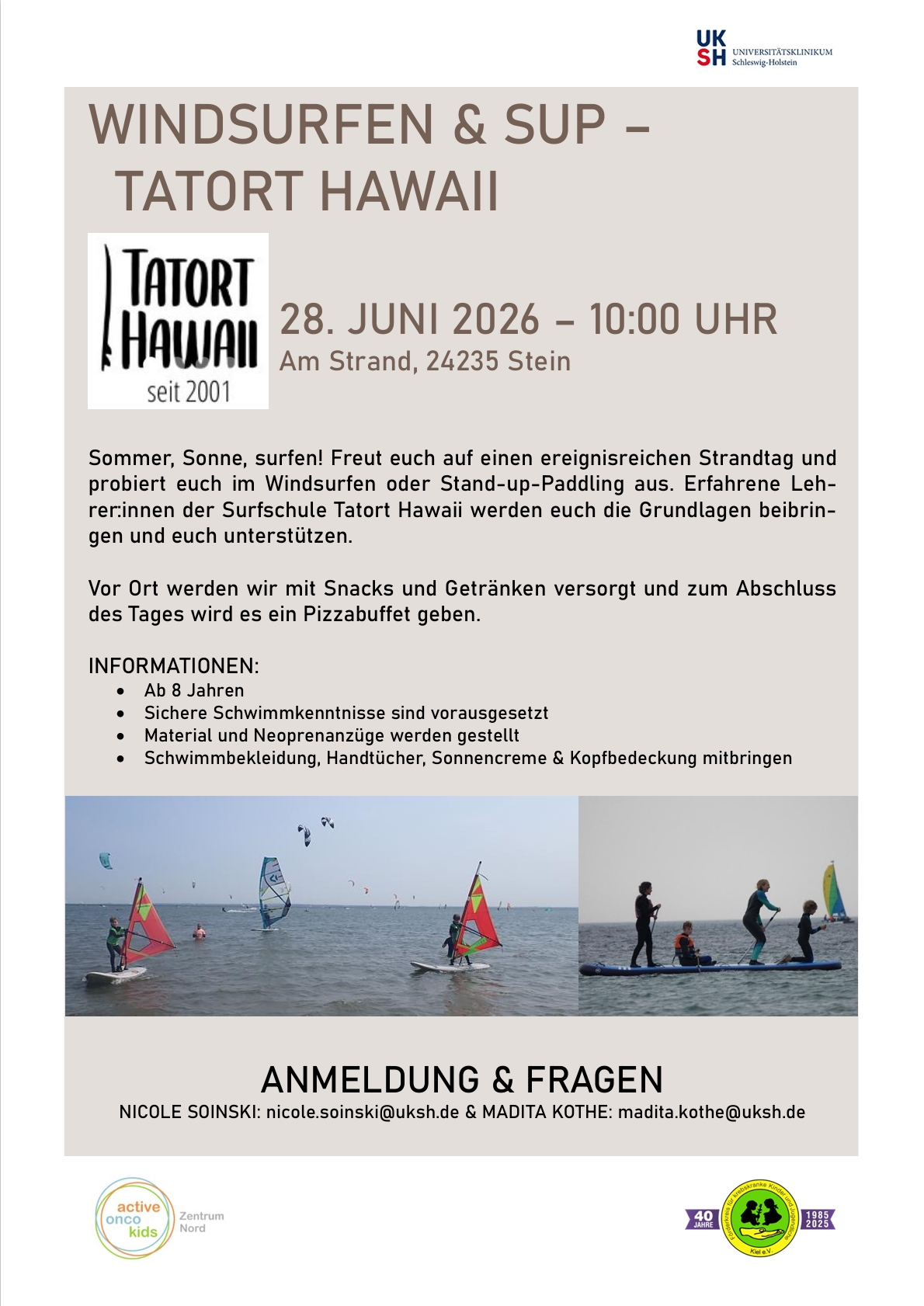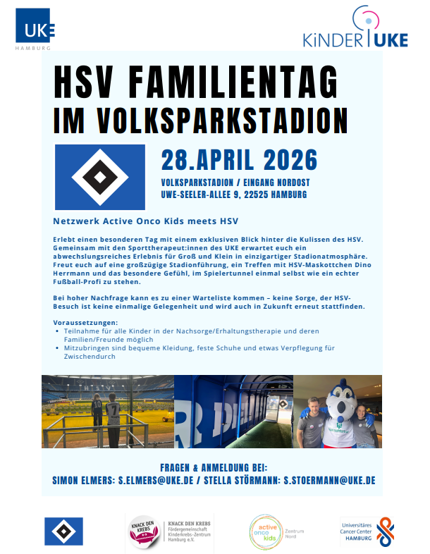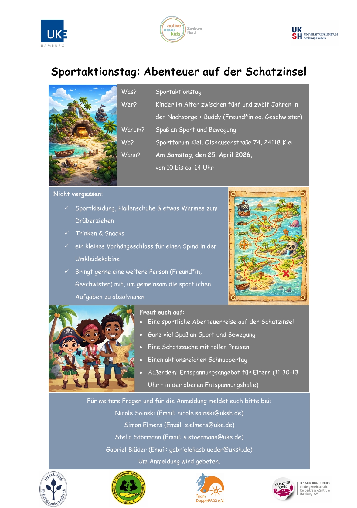 Das ActiveOncoKids Zentrum Nord mit den Standorten Hamburg, Lübeck, Kiel und Sylt, veranstaltet seit 2021 Schnuppertage im Norden zu verschiedenen Sportarten für Kinder und Jugendliche in der Nachsorge und der Erhaltungstherapie. Damit wollen wir unseren Patient:innen den Weg zurück in den Sport vereinfachen. Kontaktiere uns unter: zentrumnord[at]activeoncokids.de.